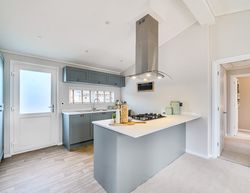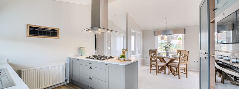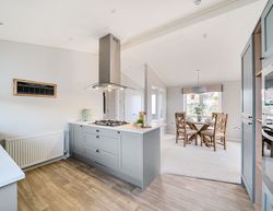 Moving through to enter the substantial kitchen and dining area. The vaulted ceilings and open plan living enhance the sense of space and light. The shaker-style kitchen units and worktops combine beauty and practicality.