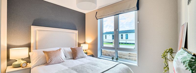 The primary bedroom is a haven of tranquillity and comfort, boasting a superior double bed with a padded headboard, colour-coordinated bed throw, runner, scatter cushions, and curtains. The feature wallpaper wall and spacious walk-in wardrobe enhance the room’s charm. Additional features include freestanding bedside cabinets, a TV socket, and plush carpet flooring, creating a space that is both luxurious and practical.