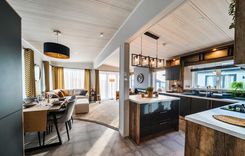 The Arrondale Park Bungalow combines luxury, comfort, and modern living in a tranquil park setting. The spacious lounge features dark wood finishes, metal accents, a flame-effect electric fire, and vaulted ceilings for a warm, elegant atmosphere. A sofa bed and armchairs add to the cosy appeal.
