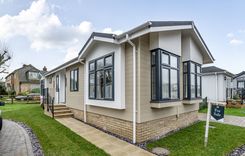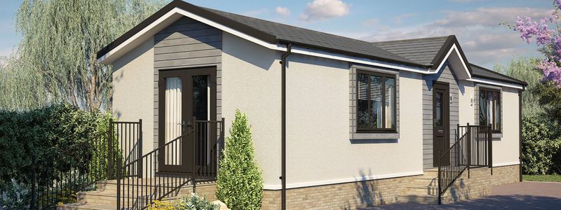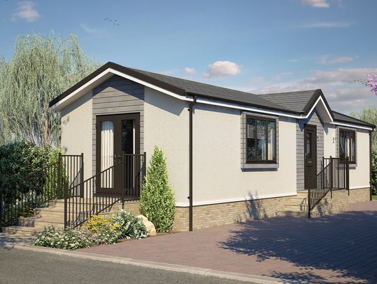 The Sonata offers a warm and inviting living space with a vaulted ceiling, electric fireplace, and comfortable furnishings. The kitchen and dining area feature shaker-style units, oak-effect worktops, and integrated appliances for convenience. The main bathroom includes a relaxing bath. The primary bedroom provides a luxurious retreat with a double bed, ample storage, and a dressing table, while the secondary bedroom is designed for comfort with a single bed and storage options.