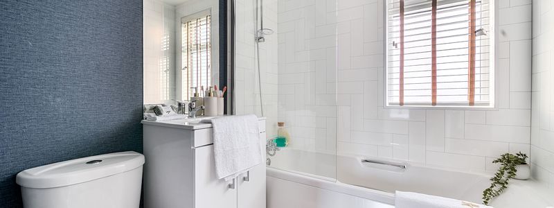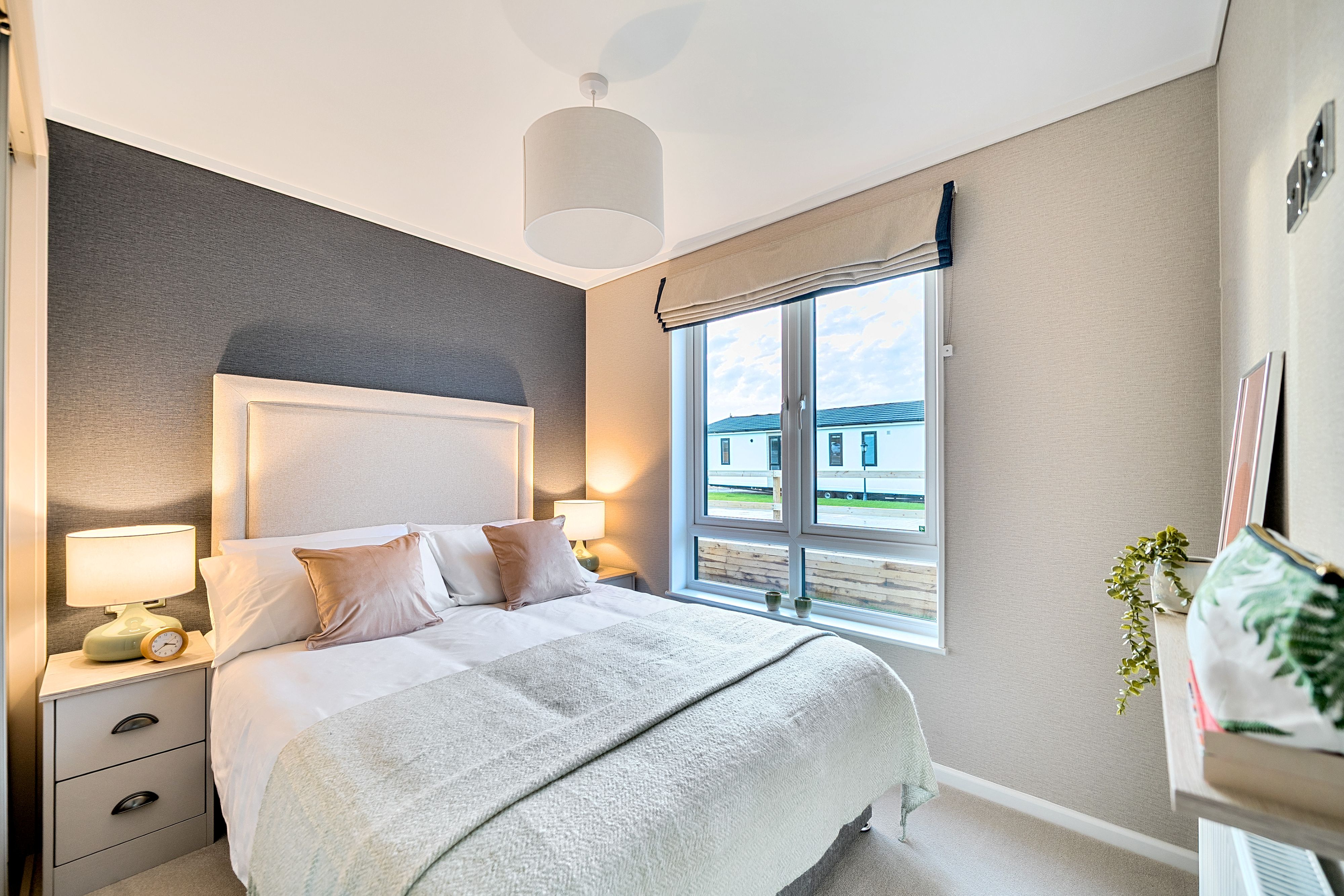 The primary bedroom offers a peaceful retreat with a superior double bed, coordinated furnishings, feature wallpaper, walk-in wardrobe, dressing table, TV point and plush carpet.