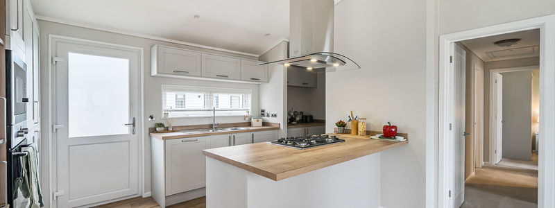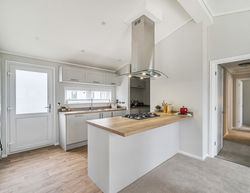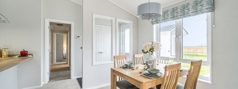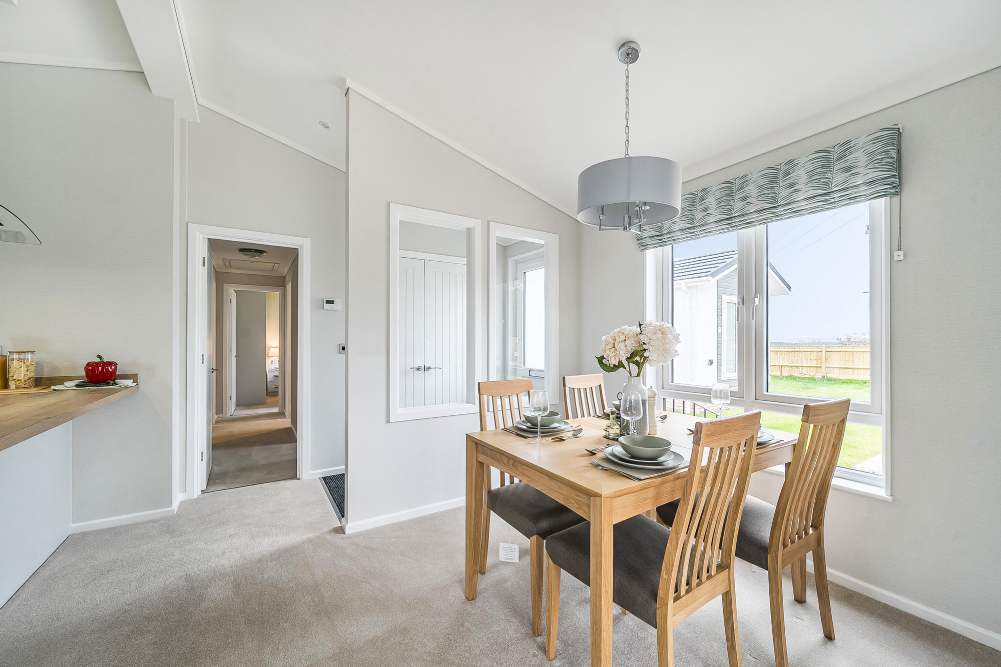 The spacious dual-aspect lounge features a vaulted ceiling and comes fully furnished with a sofa, armchairs, coffee table and full-length curtains—perfect for relaxing or entertaining. Double doors lead to the generous kitchen-dining area, showcasing shaker-style units, oak-effect worktops and integrated appliances, including an eye-level oven, five-burner gas hob, fridge/freezer, dishwasher, microwave and washing machine, plus a dining table and chairs.