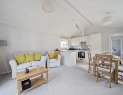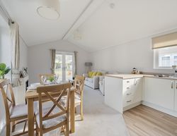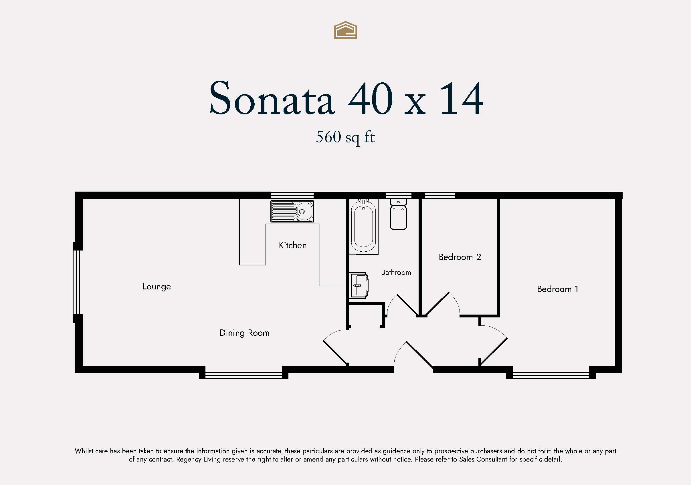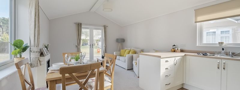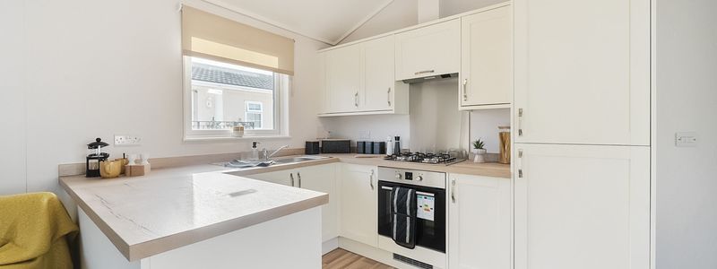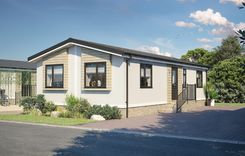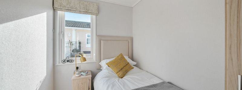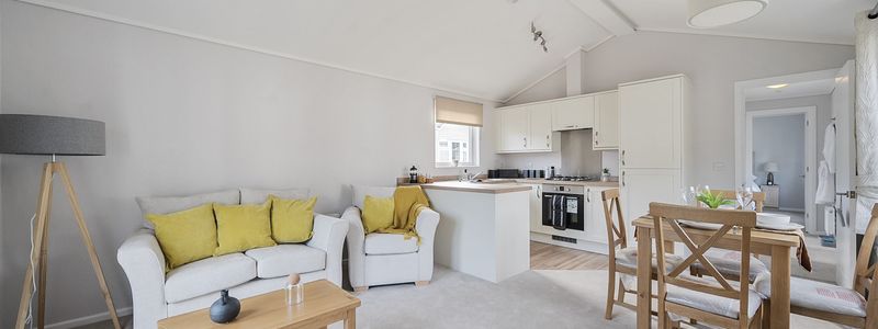The Sonata offers a warm and inviting living space with a vaulted ceiling, electric fireplace, and comfortable furnishings. The kitchen and dining area feature shaker-style units, oak-effect worktops, and integrated appliances for convenience. The main bathroom includes a relaxing bath. The primary bedroom provides a luxurious retreat with a double bed, ample storage, and a dressing table, while the secondary bedroom is designed for comfort with a single bed and storage options.