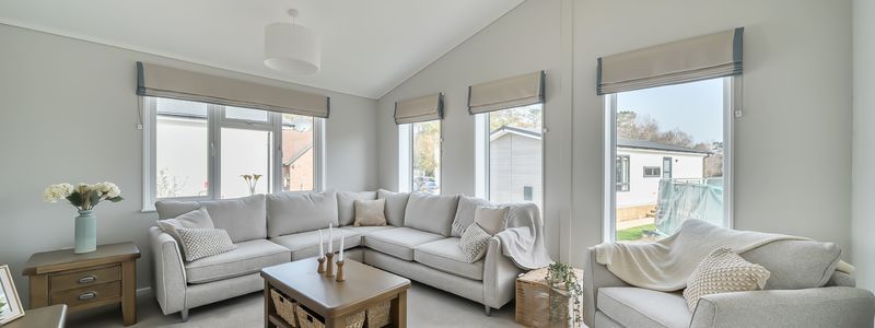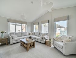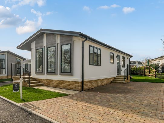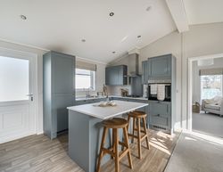 Inside, vaulted ceilings enhance the open-plan lounge and stylish kitchen, complete with oak effect worktops, an island, and premium appliances. The primary bedroom offers a kind-size bed, feature wall, and en-suite walk-in shower, while a guest room and main bathroom with full-size bath completes the home.