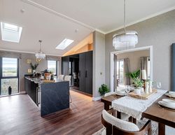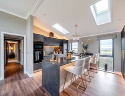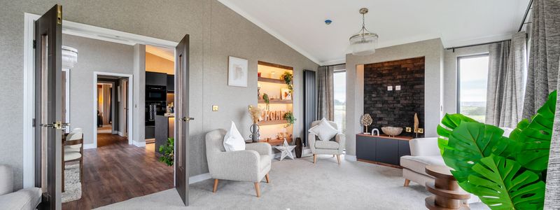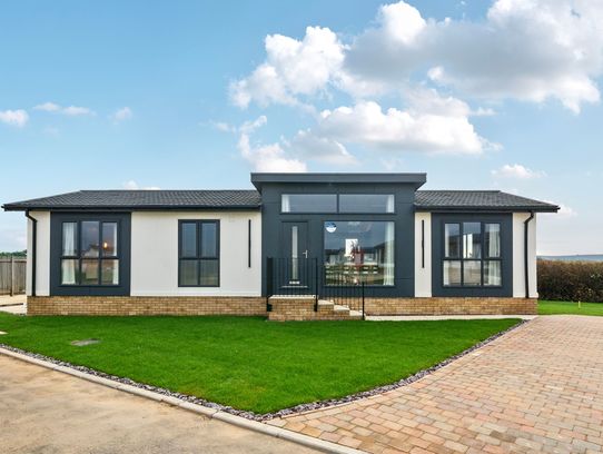 Its striking exterior features a glazed central atrium, stucco finish, and sleek cladding options. Inside, vaulted ceilings, skylights, and expansive glazing create a bright, open-plan living space. The kitchen is a chef’s dream with Silestone worktops, Bosch appliances, a wine cooler, and a large breakfast bar. The lounge is elegant yet cosy, with French doors and a bespoke media wall. The master suite includes a king-size bed, walk-in dressing area, and luxury en-suite with his and hers basins and drench shower. A second bedroom and a main bathroom with a freestanding bath complete the home. Built to BS 3632 standards with a 10-year structural warranty,