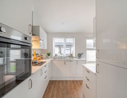 Outside, the crisp white render, dark grey frames, and feature entrance give the home a contemporary look, while patio doors connect seamlessly to outdoor spaces. Inside, an integrated kitchen, separate utility room, efficient heating, and double glazing ensure easy, year‑round living.