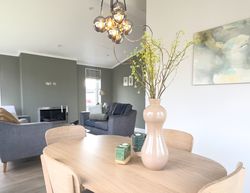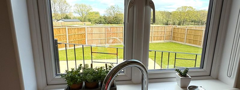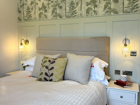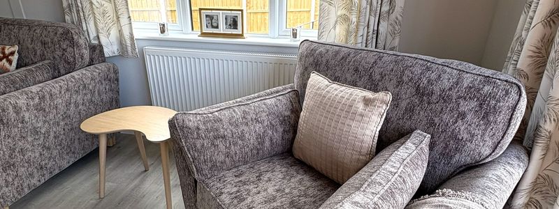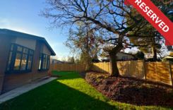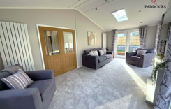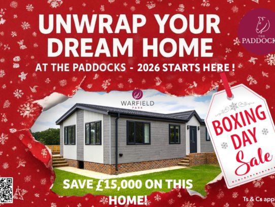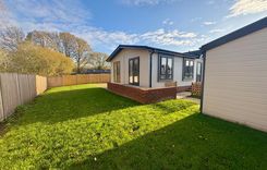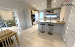 At 40 The Paddocks discover this stunning Harbur H4 home made in the UK 48' x 22' home offers exceptional insulation and lower energy bills, ensuring year-round comfort. This fully furnished home at 40 The Paddocks features a spacious, open-plan living and dining area, with a modern kitchen equipped with top-spec integrated AEG appliances, including a double eyelevel oven, fridge/freezer, dishwasher, and Belfast sink with Mirostone worktops. The park home boasts two generous double bedrooms, with the master featuring a walk-through dressing area, fitted wardrobes and en-suite shower room. The second bedroom also offers ample built-in storage. A stylish main bathroom with a rainfall shower over the bath adds to the luxury. A detached garage with a spacious driveway for two cars • Front and back ramps for easy access • A beautifully landscaped garden.